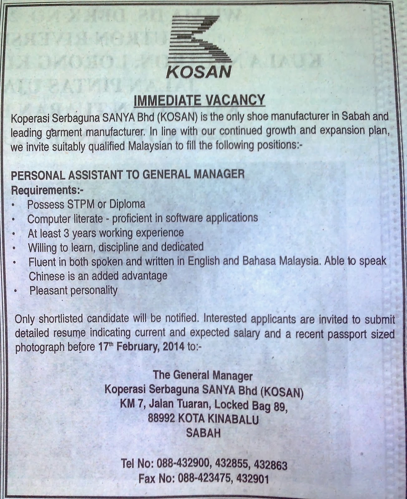 Job Vacancy In Sabah Personal Assistant To General Manager